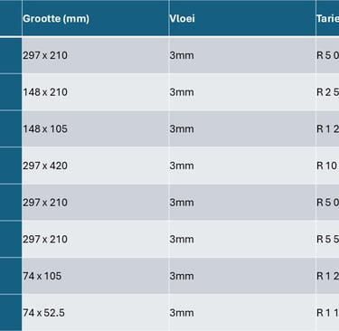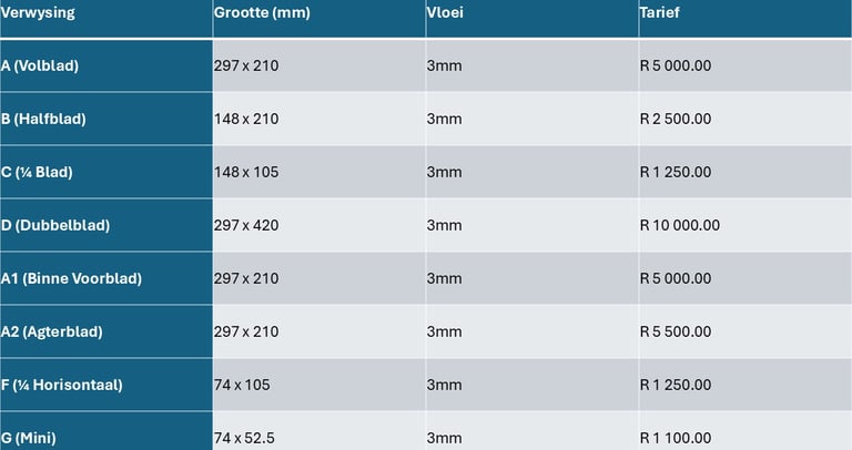 Verskeie advertensie groottes en tariewe vir jou publikasie beskikbaar.